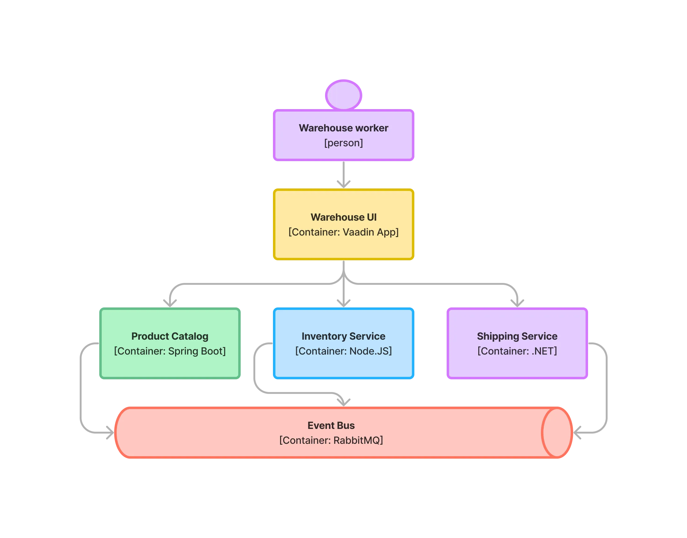 In this fictional organization, the warehouse workers need access to both the product catalog, the inventory service and the shipping service. These microservices are all maintained by different teams, who use different frameworks (such as Spring Boot, Node.js and .NET) to build them. The microservices expose REST API:s for the user interface to use while communicating with each other through an event bus.